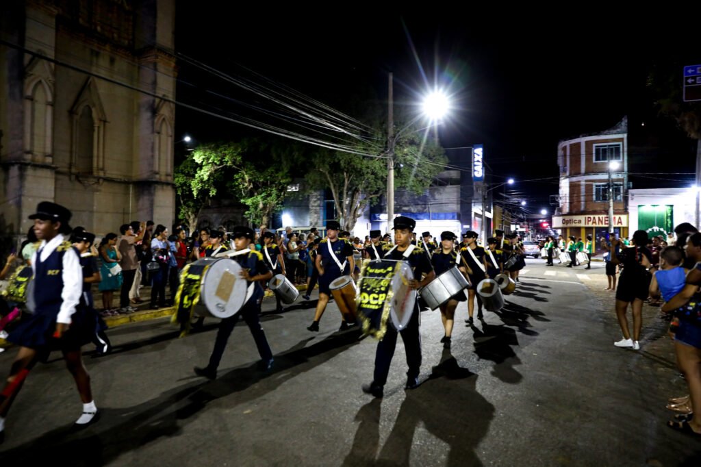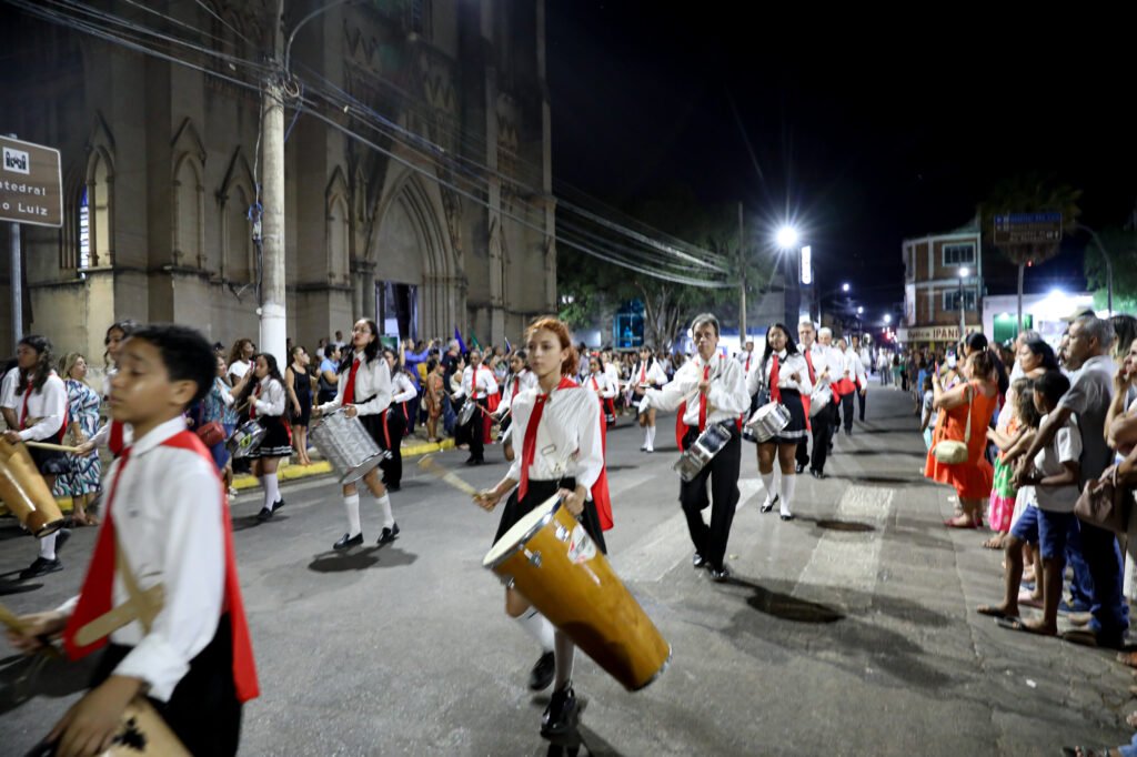 Logo após a celebração religiosa presidida pelo Padre Jair Fante, com a participação do Padre Hélio, a Praça Barão do Rio Branco se transformou em palco de um vibrante desfile de fanfarras, que encantou o público e encheu o centro histórico de sons, cores e muita alegria.