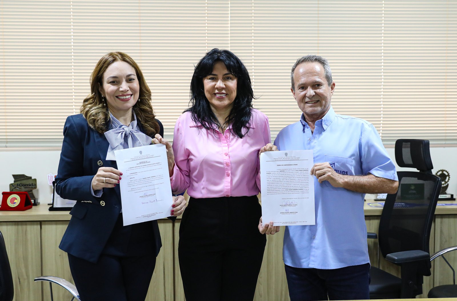 A prefeita de Cáceres, Eliene Liberato Dias, empossou na tarde da última segunda-feira a nova Diretora Executiva da Autarquia Águas do Pantanal, advogada Samara Brant Ferreira, e o contador Júlio César Parreira Duarte como secretário municipal de Finanças.